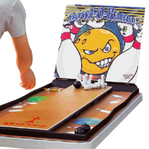 ミニボウリングゲーム。倒れたピンはひもを引くと立ち上がります。